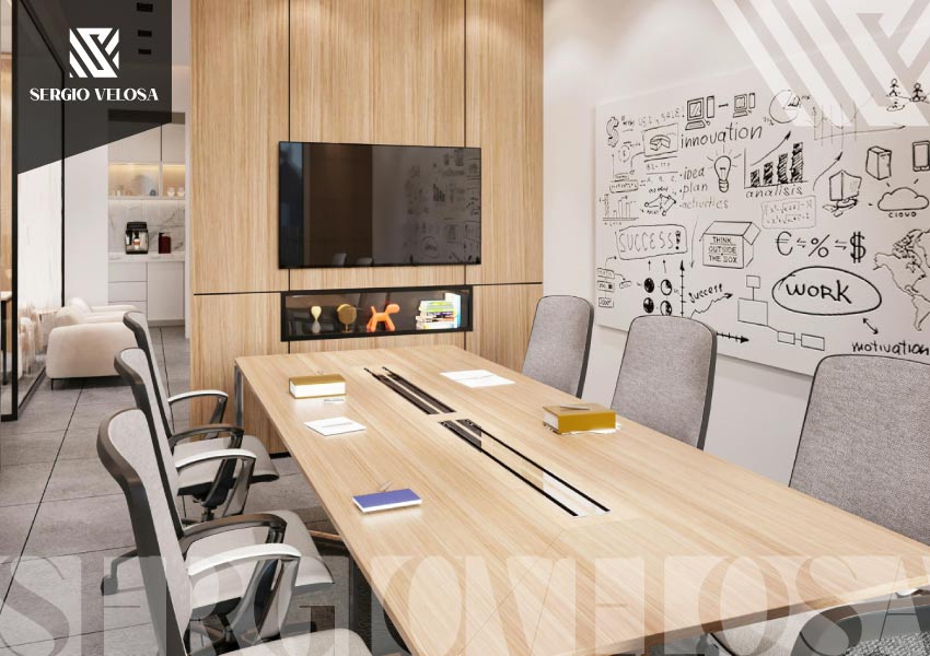 Para oficinas en casa o salas de reuniones. Diseñado para pantallas de videoconferencia con gestión oculta de cables, regletas integradas y almacenamiento para equipos electrónicos.